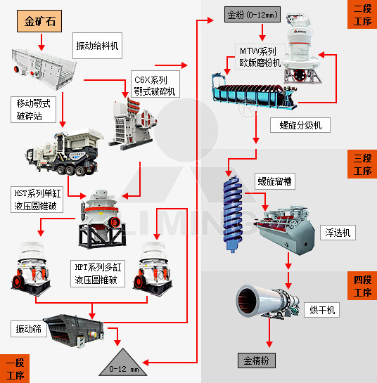 大塊的金礦石經(jīng)料倉由振動給料機均勻地送進顎式破碎機或粗碎移動站進行粗碎;粗碎后的金礦石經(jīng)過振動篩篩分后,由皮帶輸送機送到單缸液壓圓錐式破碎機進行中碎;中碎后的金礦石物料送入多缸液壓圓錐式破碎機進行細碎;